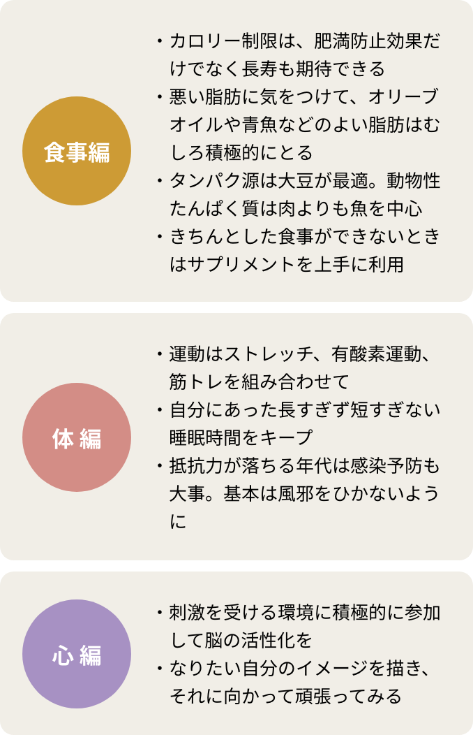 - バランスの取れた食事、適度な運動、良い睡眠など、ホリスティックなアプローチが大切。